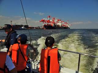 また、実習船「白鴎」(大型モーターボート)の乗船体験では、海風に吹かれながら、停泊中の超大型コンテナ船や六甲アイランドのコンテナ埠頭など神戸港の港湾施設を見学し、普段は見ることのない海側からの景色を楽しみました。