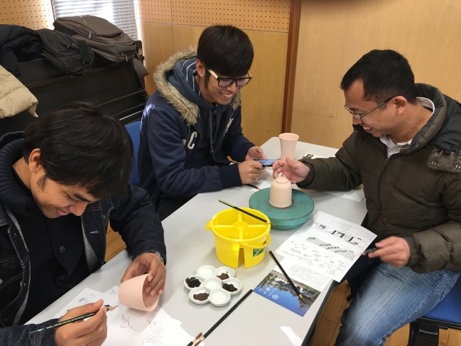 午後は篠山市民センターに移動し、「陶器への絵付け体験」を実施しました。丹波篠山地方には多くの陶器工房がありますが、今回ご指導いただいた陶工 児玉 玲央奈氏が所属する『王地山(おうじやま)陶器所 』は、江戸時代中頃から明治時代初期まで、青磁・染付・赤絵など中国風の磁器なども製作していた藩窯(はんがま)をルーツとする工房です。あらかじめ用意いただいた色んな種類の焼成前の器から好きなものを選んで、焼成後に藍色になる染料で思い思いの絵付けをしました。神戸大学のロゴマークを描く人、お世話になった先生にお礼の言葉を描く人、それぞれの思いと個性が詰まった陶器は1〜2か月後に焼成された完成品として届く予定です。