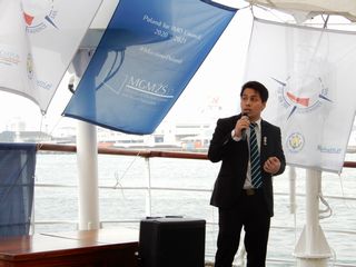 ダル・ムウォジェジ号の甲板にて、船長等の歓迎挨拶に始まり、グディニャ海洋大学の学生によるポーランドについてのプレゼンテーション、海事科学部の学生Ahmad Asraf Bin Mohd Nooさんによる海事科学部及び日本での生活等についてのプレゼンテーションが行われました。