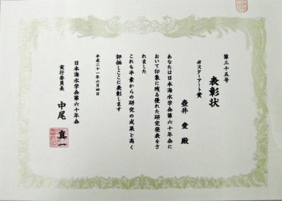 日本海水学会第六十年会において、壷井愛さんがポスターアート賞を受賞しました(6月4日)。 研究発表のタイトルは「船舶用および漁網用防汚剤の水環境における運命」でした。 同賞は優れたポスター発表に贈られるものです。