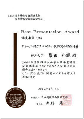 日本機械学会関西学生会平成21年度学生員卒業研究発表講演会(2010年3月15日、神戸)において、