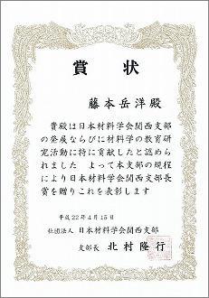 4月15日、マリンエンジニアリング講座藤本岳洋准教授が日本材料学会関西支部より支部長賞を受賞しました。この賞は日本材料学会関西支部の発展ならびに材料学の教育研究活動に特に貢献したとして贈られたものです。