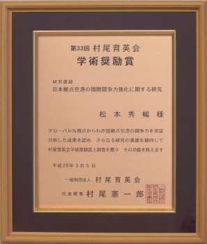 松本秀暢准教授は、「日本拠点空港の国際競争力強化に関する研究」を研究課題とし、審査対象となった5編の全論文が国際的に評価の高い英文ジャーナル等の第一著者あるいはCorresponding Authorであること、また国際共同研究であることが高く評価されました。