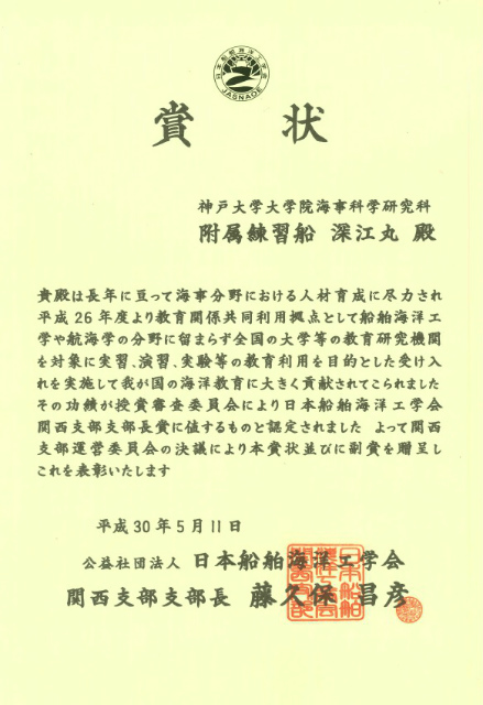 5月11日、「日本船舶海洋工学会関西支部長賞」の授賞式が行われ、練習船深江丸が受賞しました。