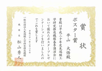 平成30年度先端膜工学研究推進機構春季講演会(2019年3月20日)において、大学院海事科学研究科博士課程前期課程海洋安全システム科学コース1年の平山大悟さん(指導教員 蔵岡孝治教授)がポスター賞を受賞しました。平山さんの受賞発表は「グラフェンを用いた有機−無機ハイブリッドガスバリア膜の作製」でした。本発表は、電気電子材料、エネルギー材料分野などで注目されているグラフェンを用いた新規な有機−無機ハイブリッドガスバリア膜に関するものであり、作製方法を中心に作製した膜の酸素バリア性、水蒸気バリア性などの膜特性について報告しました。同賞は春季講演会で優れたポスター発表を行った学生に贈られるものです。