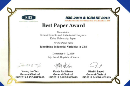 The 20th International Symposium on Advanced Intelligent Systems(ISIS-2019)において、沖本天太 准教授と平山勝敏 教授がBest Paper Awardを受賞しました。